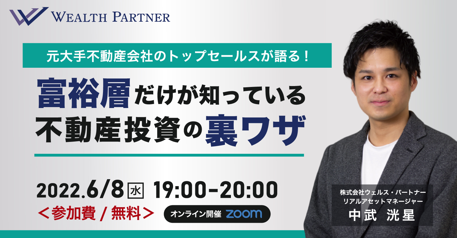 2022年6月8日(水)19:00〜20:00に当社主催セミナー「元大手不動産会社のトップセールスが語る!富裕層だけが知っている不動産投資の裏ワザ」をオンラインで開催いたします。