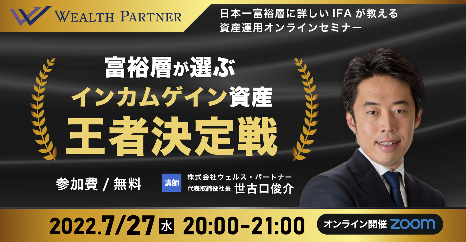 2022年7月27日(水)20:00〜21:00に当社主催セミナー「富裕層が選ぶインカムゲイン資産・王者決定戦」をオンラインで開催いたします。