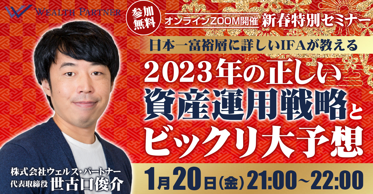 1月20日(金)21時から新春特別セミナー「2023年の正しい資産運用戦略とビックリ大予想」をオンラインで開催いたします。