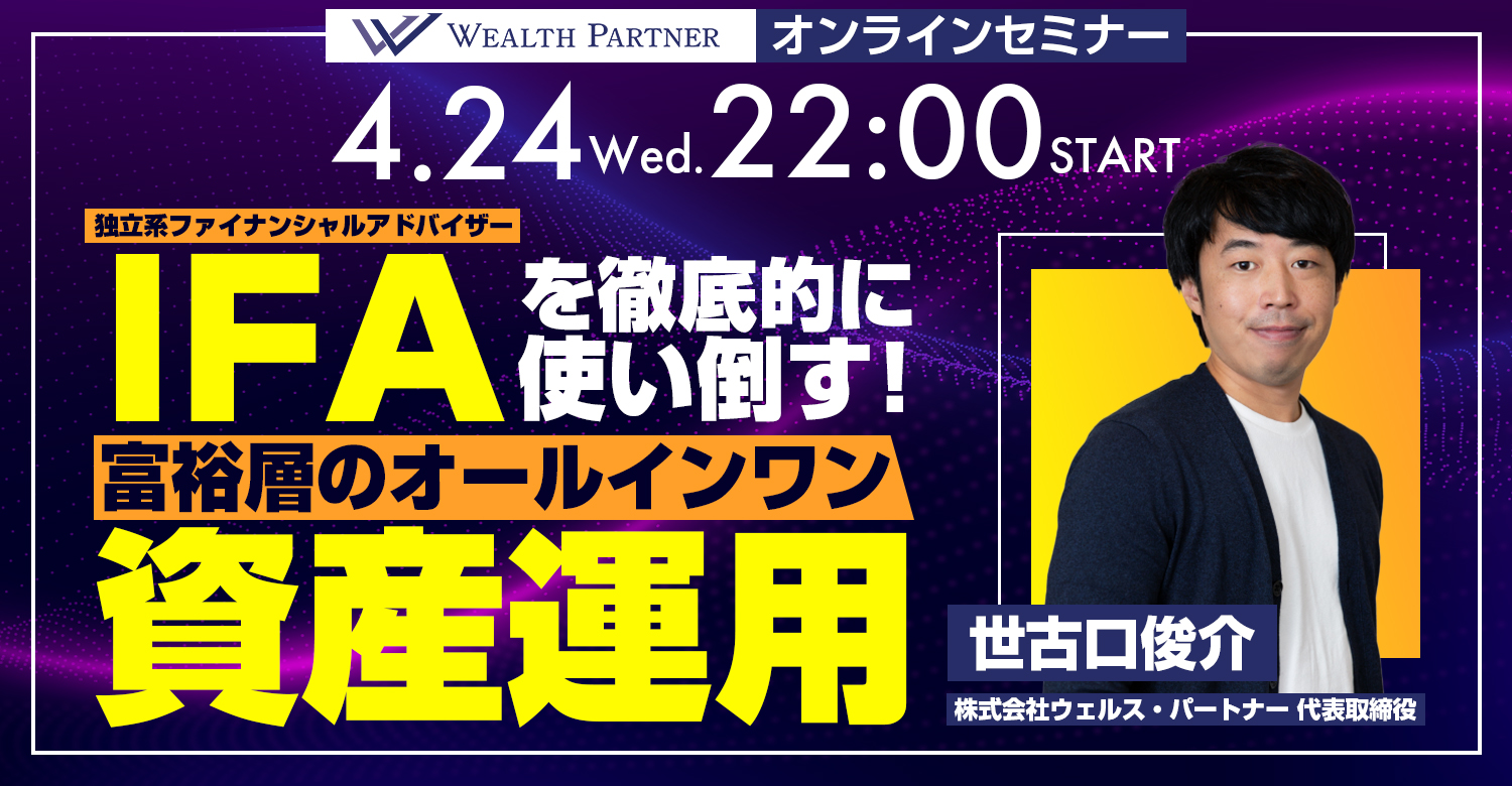 2024年4月24日(水)22時から当社主催セミナー「IFAを徹底的に使い倒す!富裕層のオールインワン資産運用」をオンラインで開催いたします。