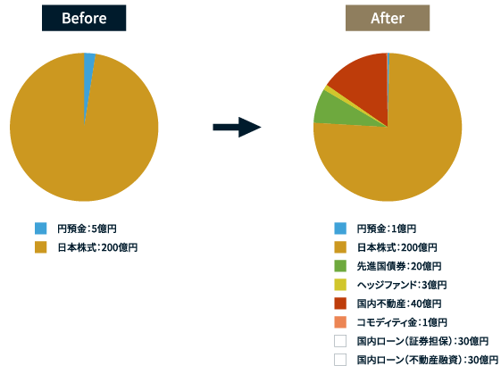 調達した資金で債券への投資と不動産投資の頭金とし、3億円程度のインカムゲインを毎年得ることができる資産配分を形成していただきました。