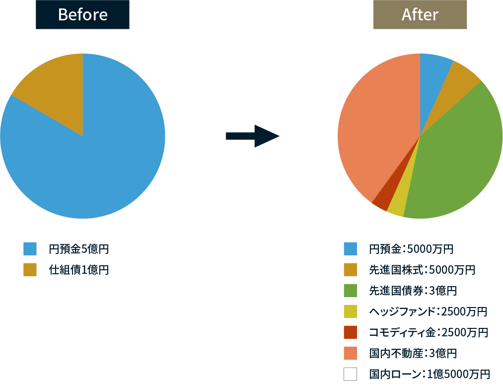 目標リターンが高くないにも関わらず仕組債など証券会社でハイリスクな金融商品に投資していたため、目標リターンを下げた低リスクな資産中心のポートフォリオをご提案しました。