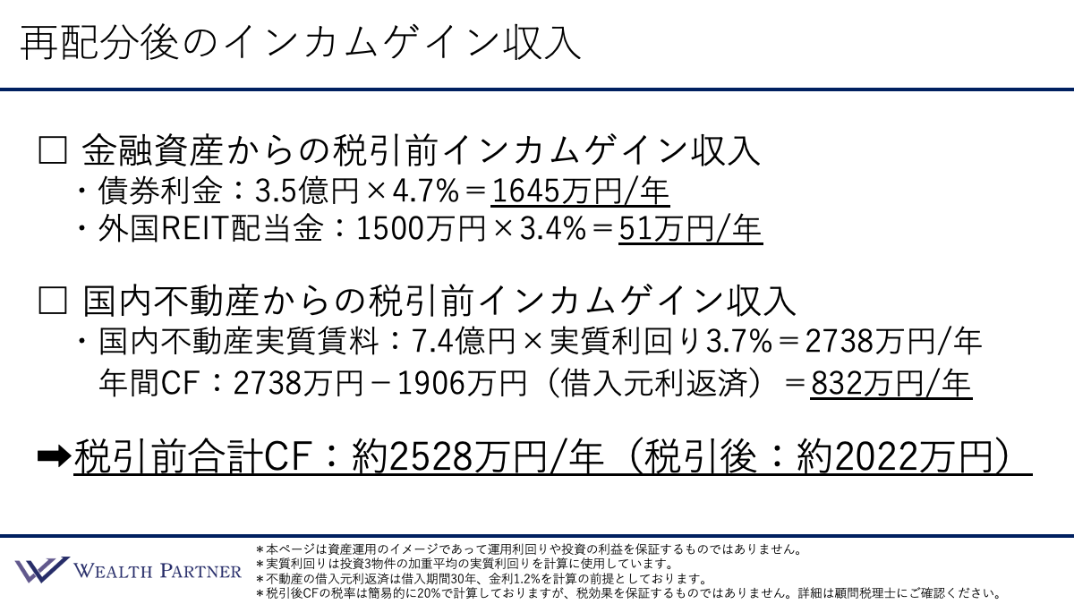 この方の現役時代の税引後手取り収入は約1,600万円でした。一方、今回の再配分後のインカムゲイン収入のイメージは、税引後約2,000万円と、400万円程度は余裕を持って目標を達成できています。