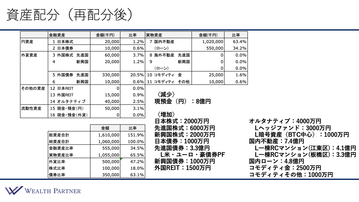 次に、金融資産と実物資産の比率は当初75%と25%と、圧倒的に金融資産に偏っていましたが、再配分後は、金融資産が34.5%、実物資産は65.5%となり、実物資産比率の方がかなり高くなりました。