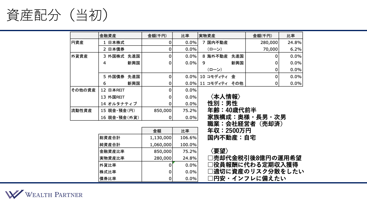 5億円規模の売却代金の実例では、投資目的をインカムゲイン獲得に絞っていたため、投資対象は2つの資産クラスに限定されていました。一方で、今回のケースでは、会社売却によって十分な資金が確保できているため、インカムゲインを十分に達成したうえで、リスク分散にも余力を割くことが可能となったのです。