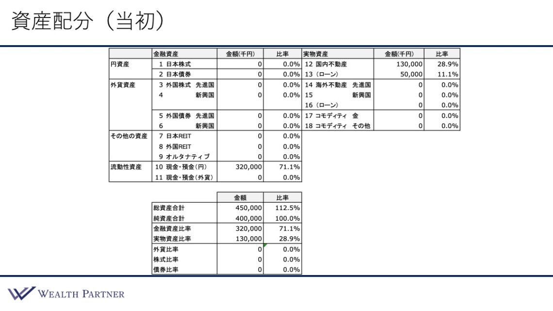 現預金3億円を使い、増加させる資産は、日本株式に2,000万円、先進国株式に6,000万円、新興国株式に2,000万円、先進国債券に1億円、外国REITに1,000万円、国内不動産に4億円、国内ローンが3.2億円、コモディティ金に1,000万円という形になっています。