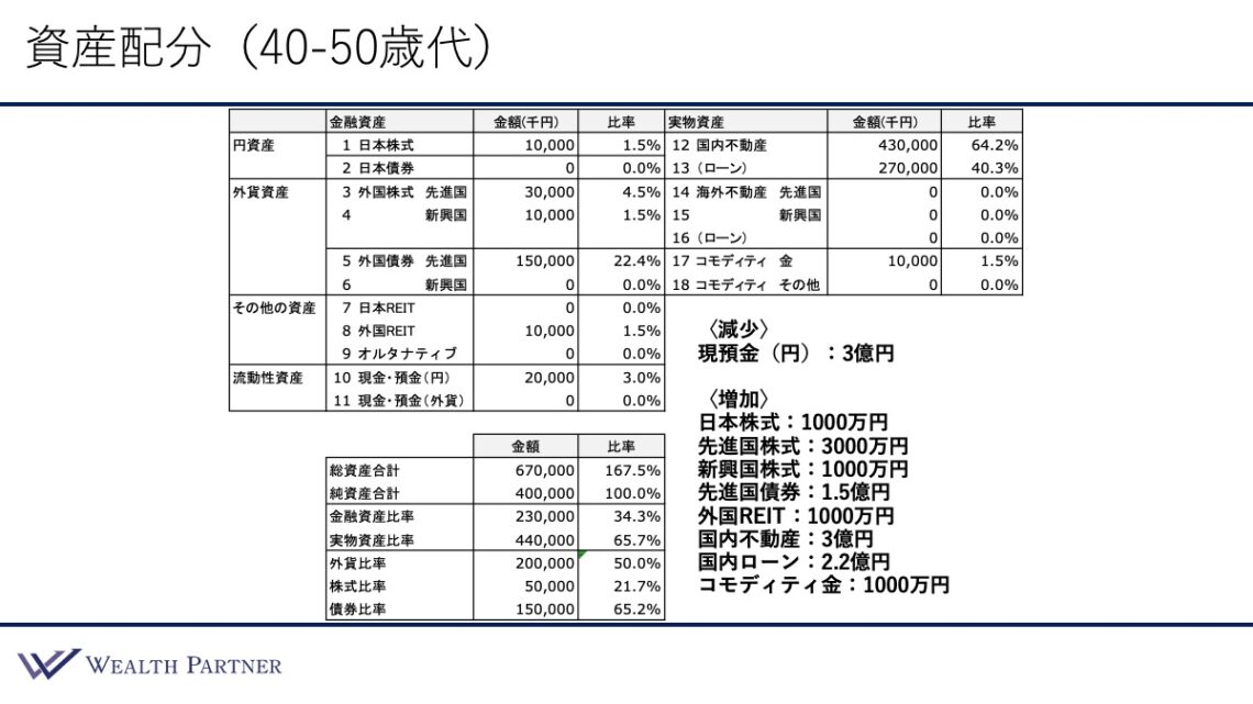 3億円の現預金を使い増加させる資産は、日本株式に1,000万円、先進国株式に3,000万円、新興国株式に1,000万円です。先ほどの20〜30歳代の方よりは株式の投資金額を少なくしているイメージです。先進国債券に1.5億円、株式を減らして債券の投資金額を増やしています。外国REITは1,000万円、国内不動産3億円に対して国内ローンは2.2億円、コモディティ金が1,000万円という配分になっています。