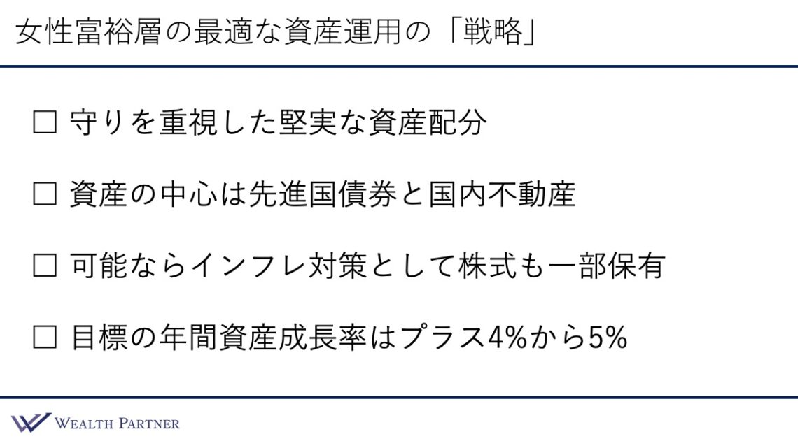 ここからは、女性富裕層の最適な資産運用戦略についてご説明します。4つの戦略を挙げています。