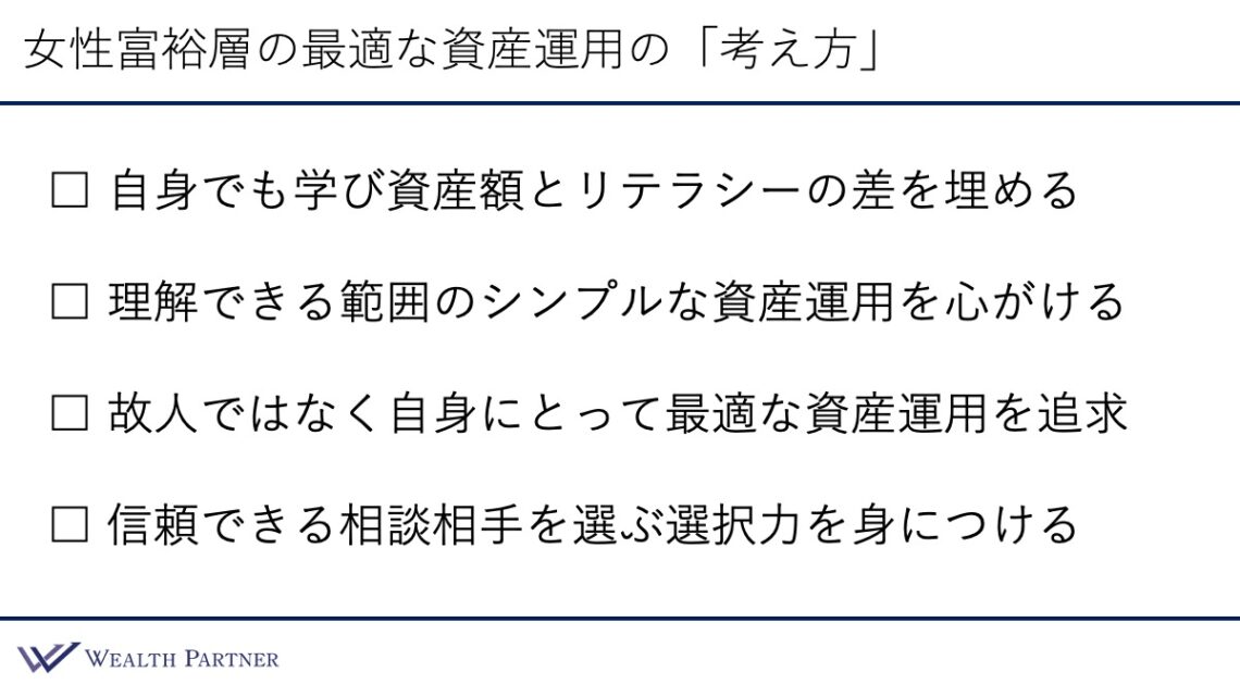 ここからは、女性富裕層の最適な資産運用の考え方をお伝えします。ポイントを4つにまとめました。