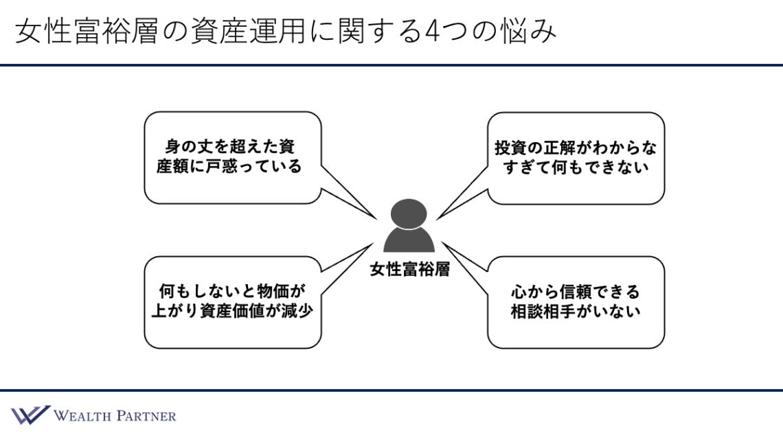 一般的な富裕層は、時間をかけて資産を増やし、資産が増えるごとに投資リテラシーを高めていくという経験を積んでいます。一方で、女性富裕層の方には相続富裕層が多いので、投資経験がないまま気づいたら多額の資産を手にしている方がほとんどです。明らかに身の丈を超えた資産額を得ているので、その状況に戸惑いを覚えている方が多いのではないかと考えます。