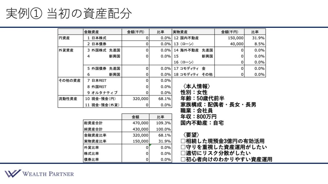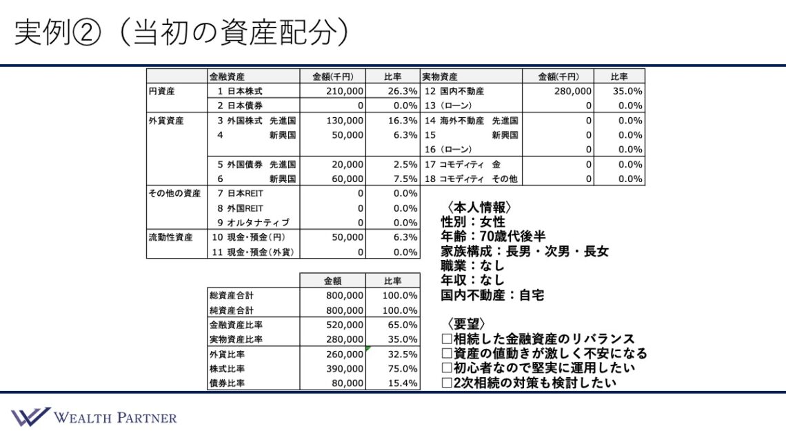 1つ目は「相続した金融資産のリバランス」です。相続されたのは金融資産が中心で、ご本人には合わないと気づいていらっしゃるので、その組み換えをしたいというご要望です。