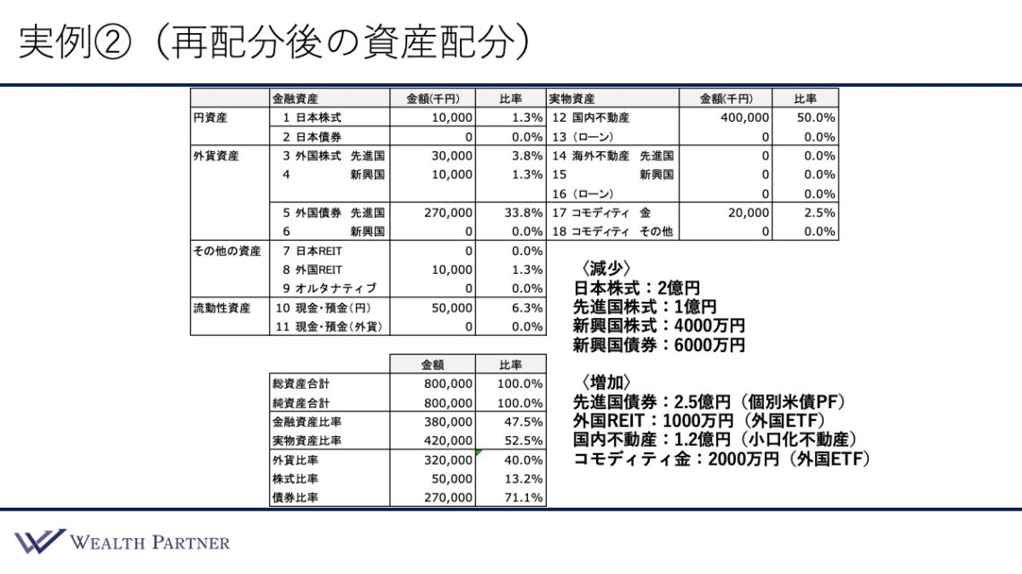 減少させる資産は、日本株式が2億円、先進国株式が1億円、新興国株式が4,000万円、新興国債券が6,000万円で、これらの資産を売却しています。株式が多すぎる状況でした。この方のリスク許容度や投資経験、求めているリターンなどには合っていないので、ほとんど売却してもよいのではないかと思いました。