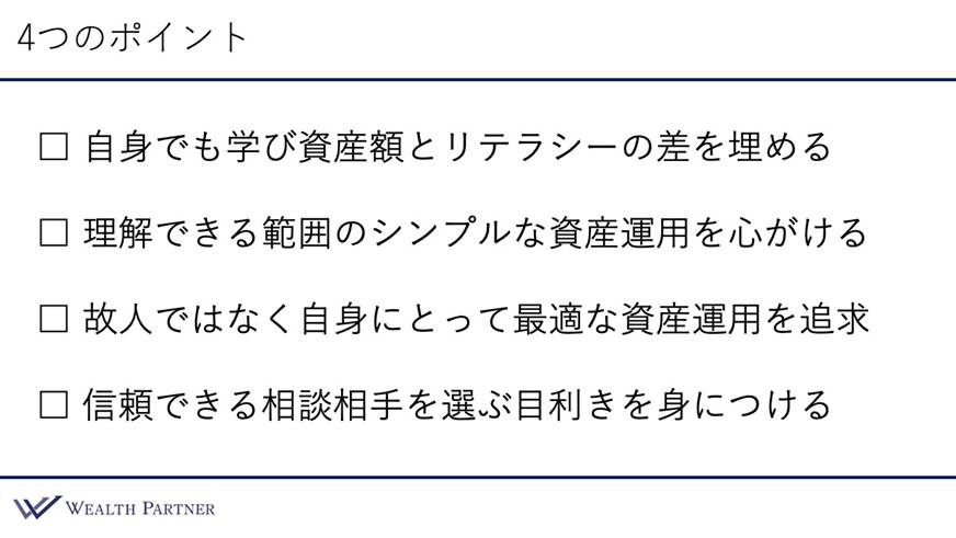 1つ目が、自身でも学び資産額とリテラシーの差を埋めることです。