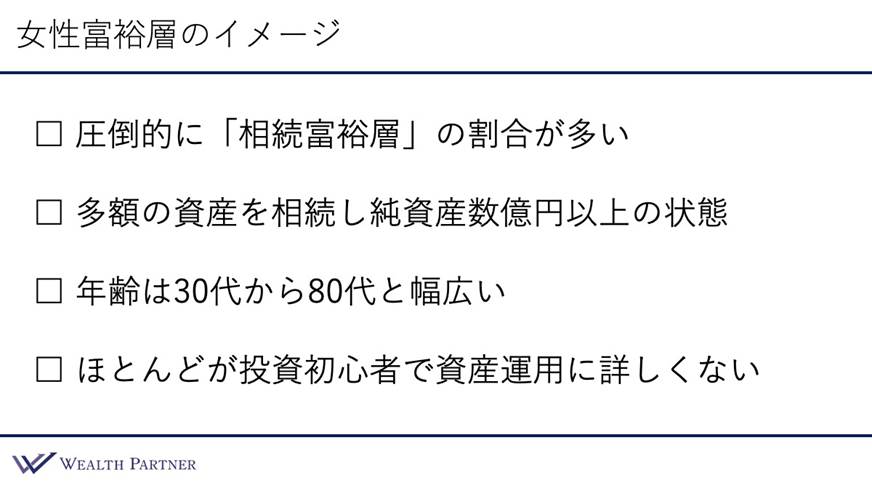 2つ目が、多額の資産を相続し純資産数億円以上の状態の女性富裕層の方が非常に多いのではないかと思っています。