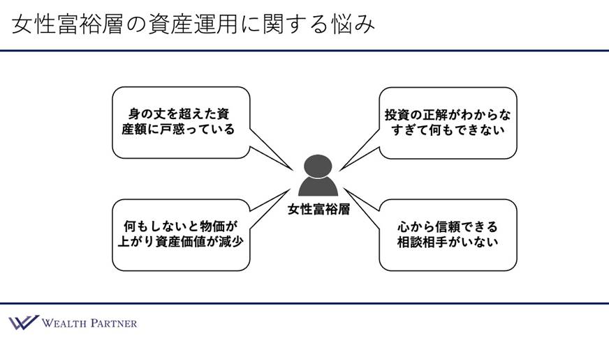 女性富裕層の資産運用に関する悩みは主に4つです。