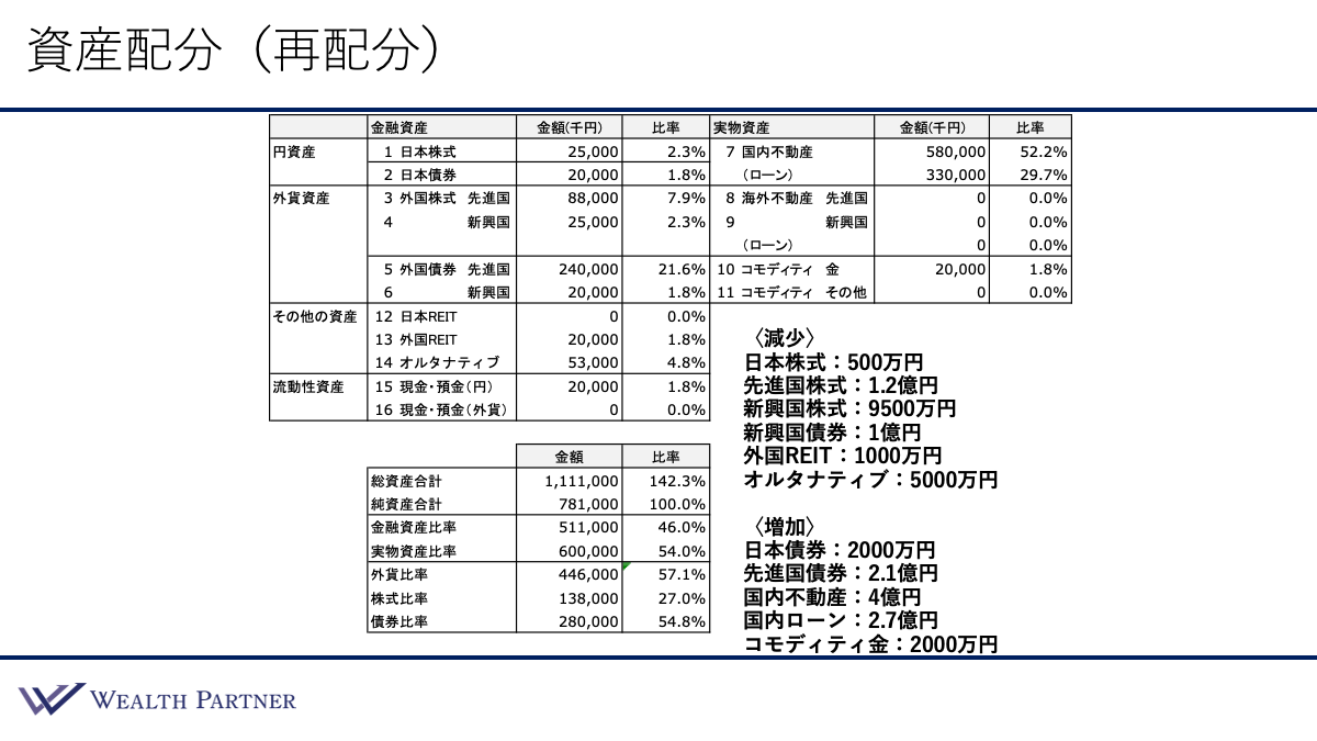日本債券2,000万円、先進国債券2.1億円、国内不動産4億円、それに伴う国内ローンが2.7億円、コモディティ金2,000万円というように再配分しました。