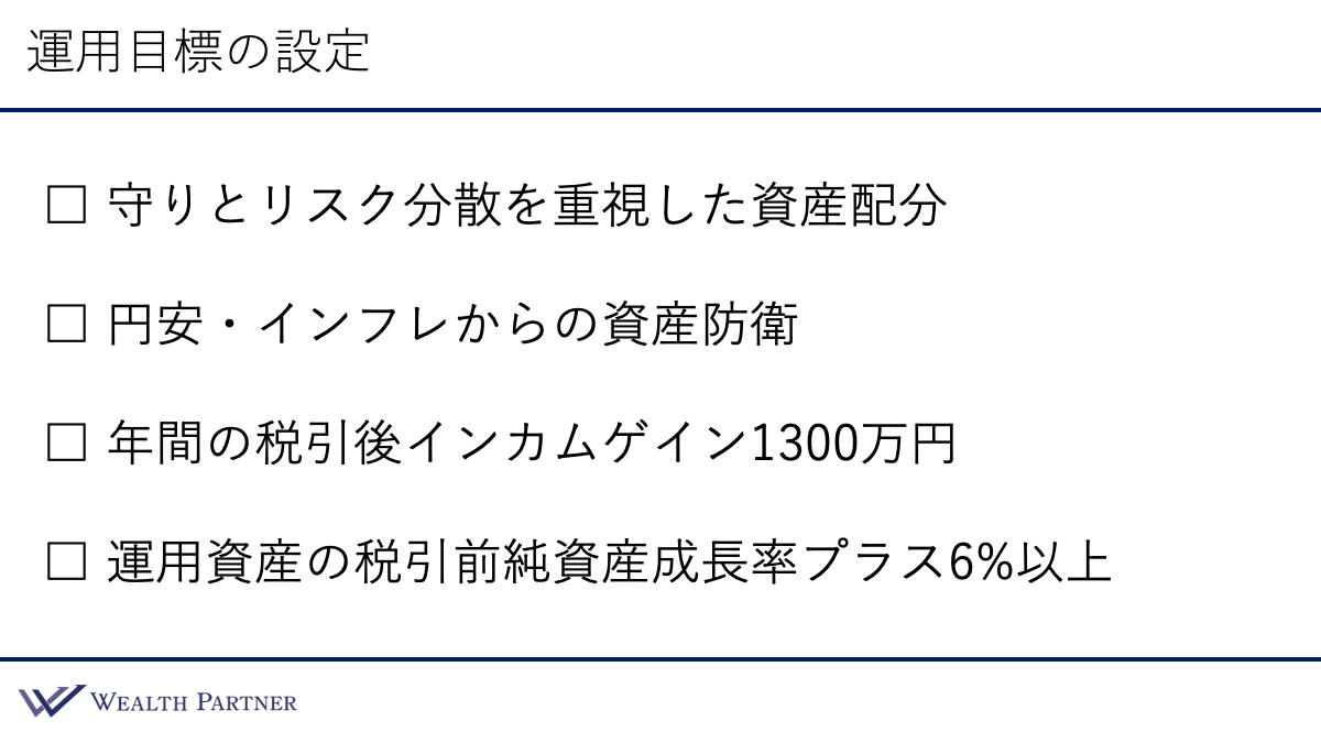 この方の資産背景、資産状況、ご要望などを踏まえ、設定した運用目標がこちらです。