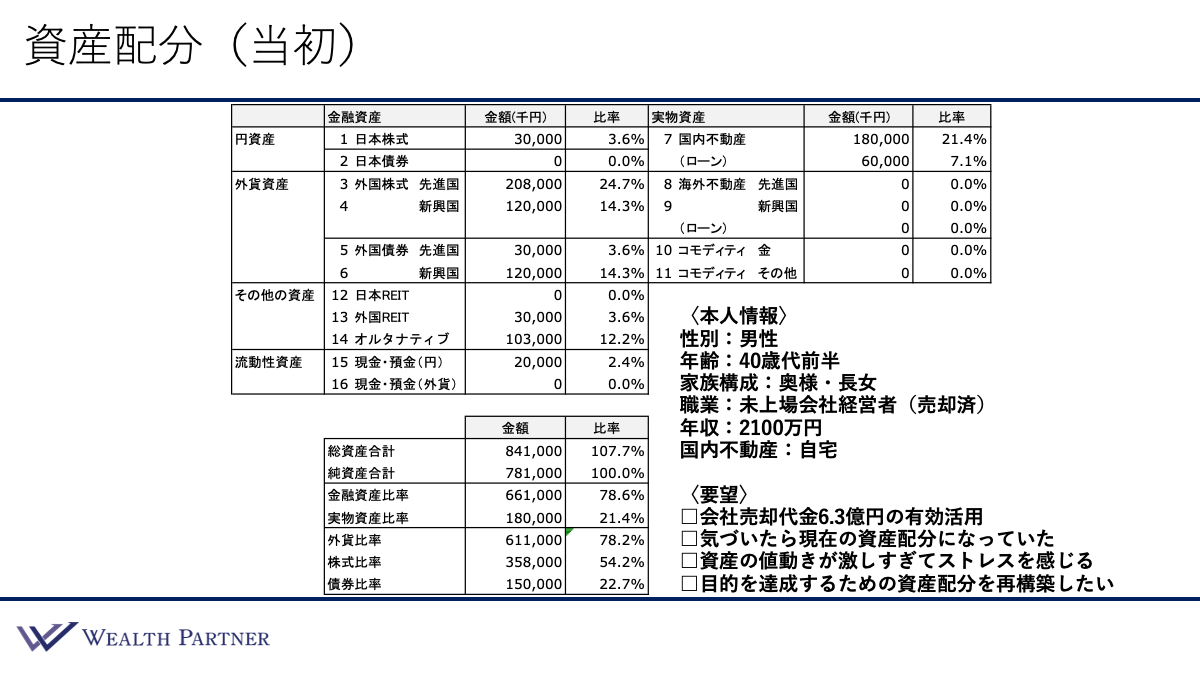 ・1つ目は「会社売却代金6.3億円(税引後)の有効活用」です。それを、金融機関でいわれるがままに投資している状態でした。
