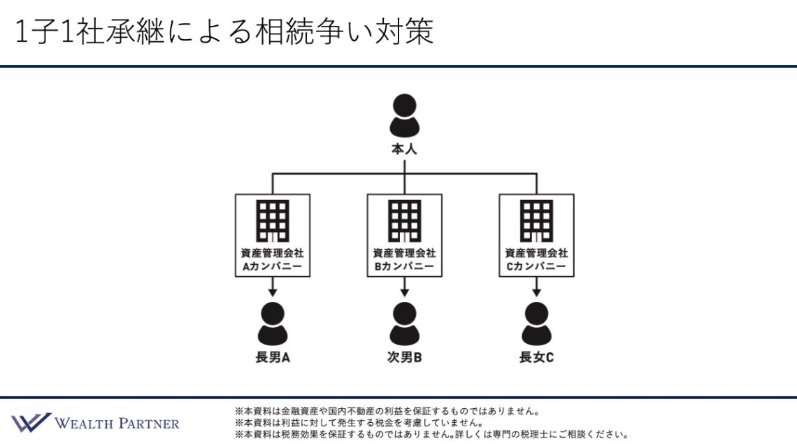 ご本人がそれぞれの資産管理会社を設立します。将来的にその資産管理会社を承継していくイメージで、それぞれ資産管理会社で資産運用するのが1子1社承継の相続争い対策です。