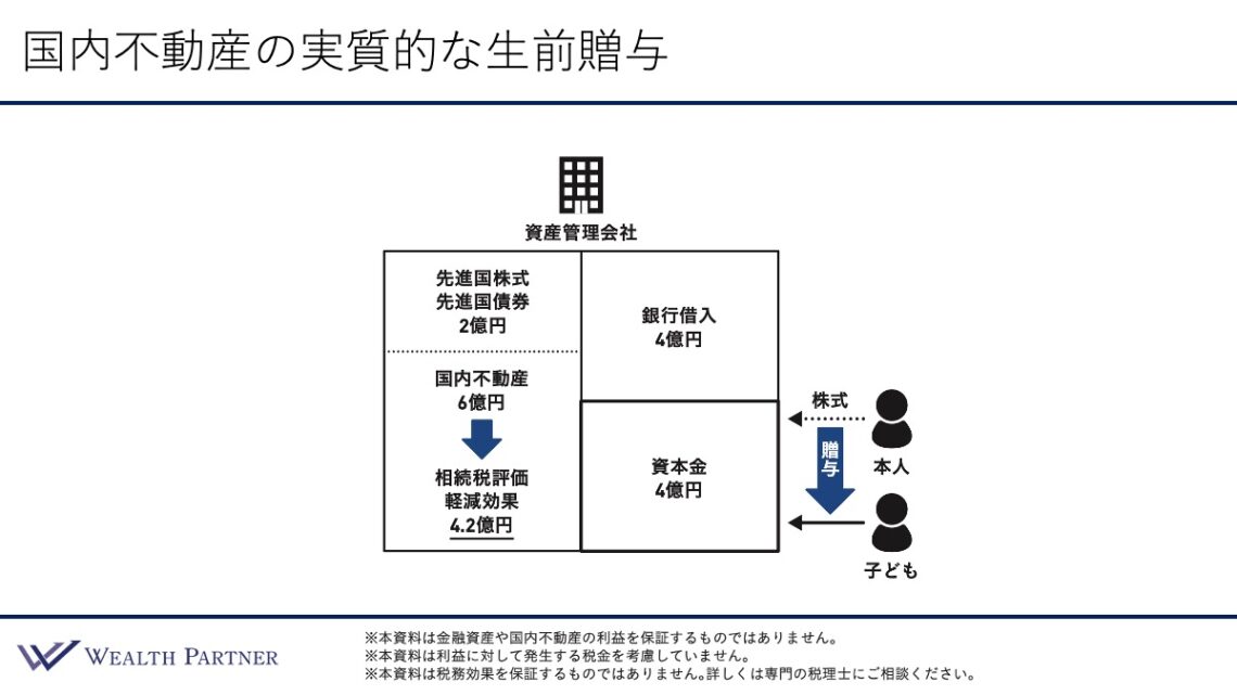 国内不動産は、個人で持っているものをそのまま贈与することはできませんが、資産管理会社で投資する方法があります。こちらのイラストは、資本金が4億円の資産管理会社を設立するケースです。