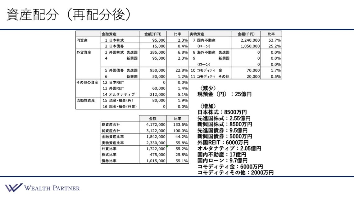 減少資産は現預金の25億円、増加資産は日本株式に8,500万円、先進国株式に2.55億円、新興国株式に8,500万円、先進国債券に9.5億円、新興国債券に5,000万円、外国REITに6,000万円、オルタナティブに2.05億円、国内不動産は17億円で、国内ローンは9.7億円、コモディティ金に6,000万円、コモディティその他に2,000万円となっています。このようにバランスよく、あらゆる資産クラスに分散して投資しています。