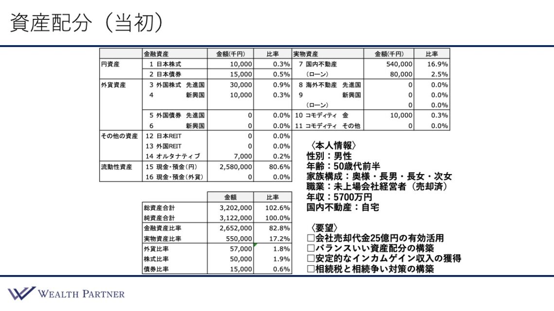 この方のご要望は主に4つあります。1つ目は「会社売却代金25億円を有効活用したい」ということです。2つ目は「バランスのいい資産配分の構築をしたい」ということです。