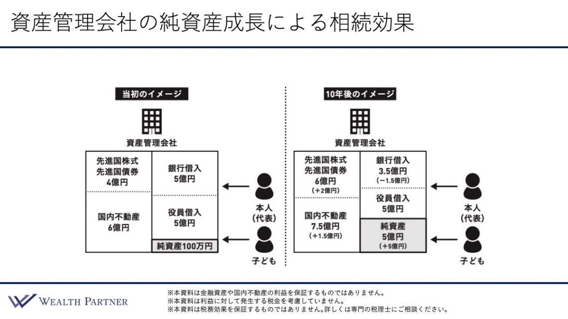 つまり、資産管理会社を通じて成長させた純資産は、すでに子供に承継された資産とみなすことができるのです。本人であれば本人に相続税がかかりますが、お子さん名義にすることによって、中長期的な相続効果が可能となります。このメリットを目的として、資産管理会社を運用している富裕層が増えています。