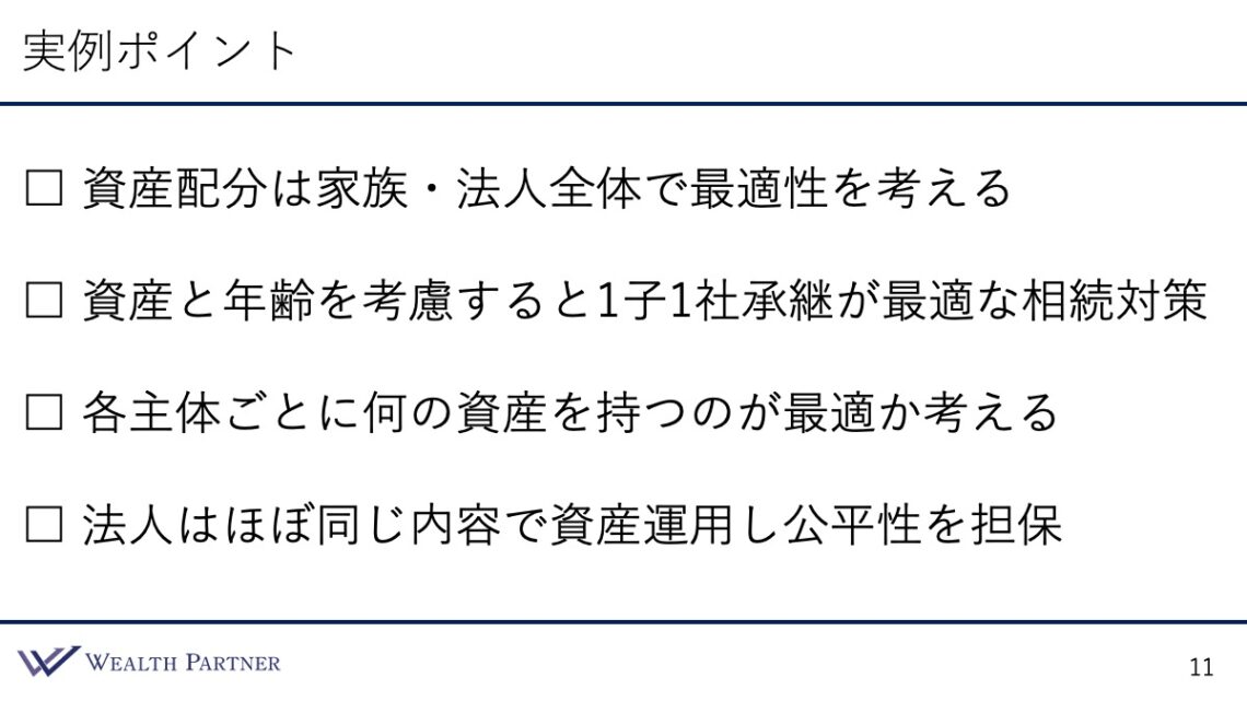 この方のようにお若く、純資産ベースで30億円あって25億円運用できる方であれば、間違いなく1子1社承継で、お子さん1人につき資産管理会社を1社作るという相続対策は最適な考え方であるといえます。