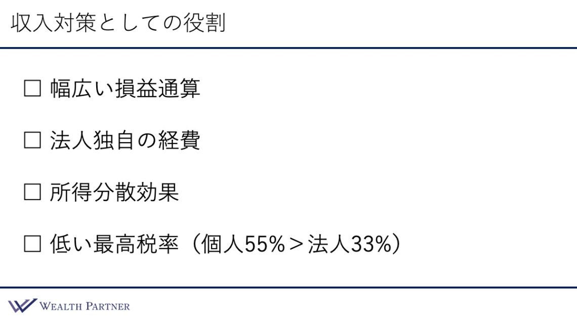 個人で得た収入(給料・事業収入・投資で得た収入)には必ず税金がかかります。資産管理会社を設立することで、その税金をできる限りミニマイズすることができます。つまり、収入に対する税金対策や節税対策としての役割があるのです。収入対策としての役割は主に4つに整理できます。