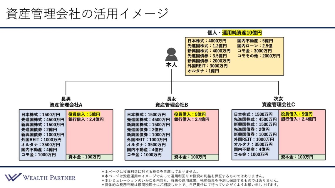 純資産100万円のお子さん名義の資産管理会社を設立しました。ご本人が役員借入として5億円を貸し付けています。銀行からさらに5億円を借入し、先進国株式や先進国債券に4億円、国内不動産に6億円投資しました。
