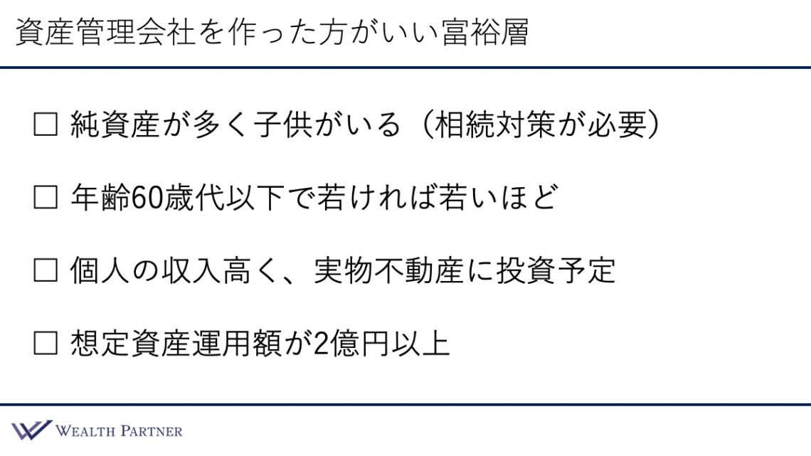 これらの条件のうち、1つよりも2つ、2つよりも3つと多く該当する方ほど、資産管理会社を作った方がいい富裕層の方といえるでしょう。