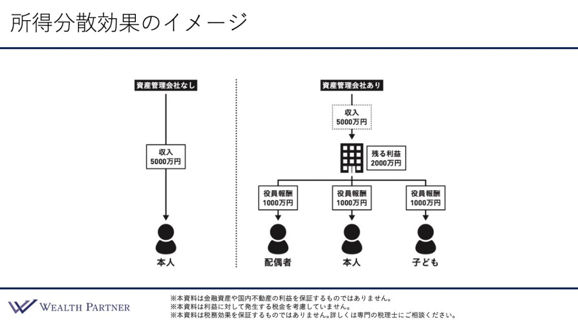 例えば、個人に年間5,000万円の収入がある場合、個人の事業所得として経費を差し引いて利益を出します。一方で、資産管理会社を作って同じく5,000万円の収入を得た場合、役員報酬という形で家族に所得を分散させることができます。例えば、配偶者と子供を役員にした場合、本人を含め3人に1,000万円ずつ役員報酬を出せば、法人に残る利益は2,000万円になります。