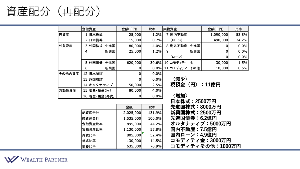 増加させる資産は、日本株式2,500万円、先進国株式8,000万円、新興国株式2,500万円、先進国債券は全体で6.2億円、このうち5億円が医療法人です。さらに、オルタナティブ5,000万円はMS法人、国内不動産は7.5億円で、それに伴う国内ローンは4.9億円、理事長個人と資産管理会社の投資となっています。そして、コモディティ金3,000万円、コモディティその他1,000万円、理事長個人のリスク分散、資産分散という割合の投資になりました。