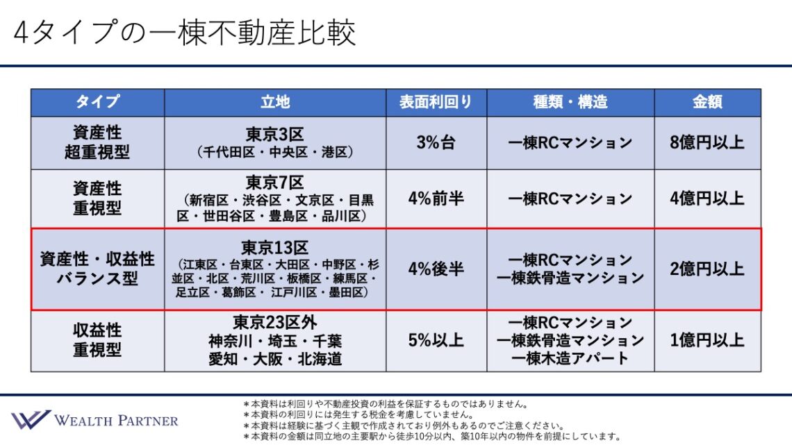 こちらは、富裕層の方が投資する、4タイプの一棟不動産を比較したものです。