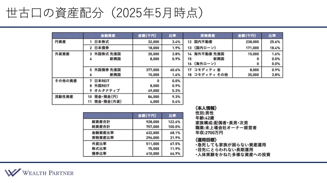私自身の情報としては、42歳の男性で、家族構成は配偶者、長男、次男の4人家族です。職業はウェルス・パートナーを経営しておりますので、未上場会社のオーナー経営者で、年収は2,700万円です。