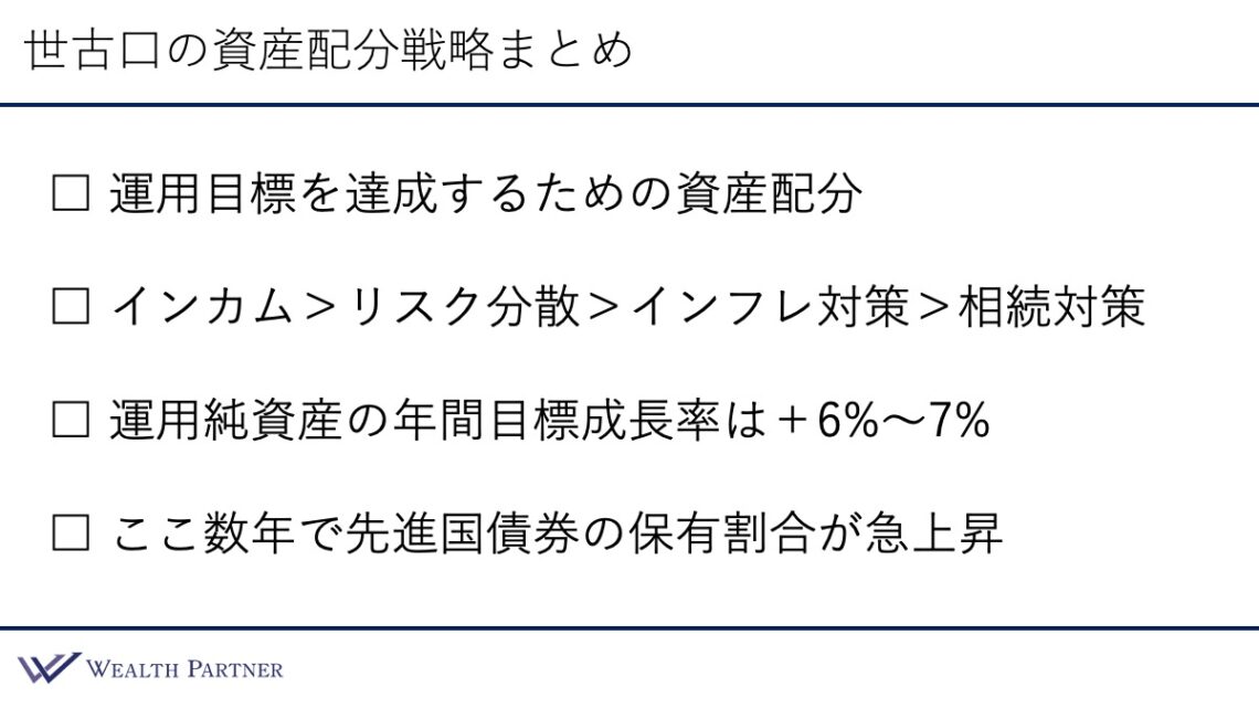 運用純資産に対する年間の目標成長率は+6%~7%の資産配分になっています。債券の割合が大きいとはいえ、債券の年利回りは5%前後でしょう。そのため、実績リターンが高いヘッジファンドや借入の活用、さらに自己資金対比の利回りが高い不動産を加えることで、全体の成長率を押し上げて+6%~7%に届くような構成になっています。