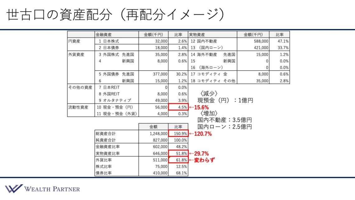 減少させる資産は、現預金1億円です。これを頭金とし、国内不動産をさらに増やしていくと良いと考えています。具体的には、頭金1億円に対して国内ローンを2.5億円借り入れ、総額3.5億円の物件を購入するイメージです。都内の一棟RCマンションが想定される投資対象になるでしょう。