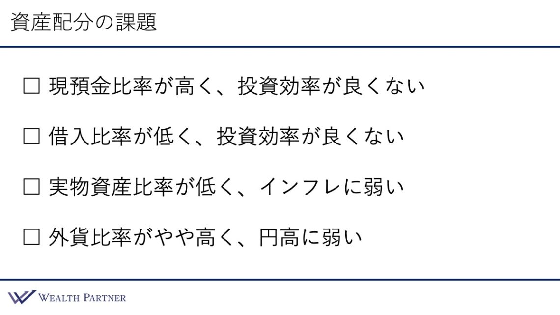 金融資産70%に対し、実物資産が30%なので、7対3の割合になっています。これはやや低いと考えています。少なくとも5割程度は実物資産で、やや高くてもよいと思うので、5割~6割を目標に実物資産比率を高めていくのがいいでしょう。実物資産比率が低いとインフレに弱くなります。物価上昇についていけない可能性が高いので、インフレに弱くなる点が課題といえます。