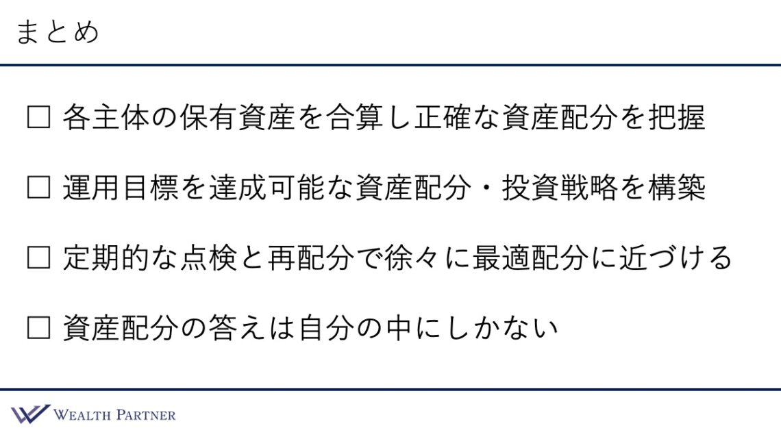 ご家族の資産も含め、ファミリーとして管理したい範囲を明確にしたうえで、各主体の保有資産をそれぞれ把握し、資産配分シートを1つにまとめて、全体のバランスを見て再配分することが重要です。まずは各主体の資産を棚卸しして、正確な資産配分を把握することから始めるとよいでしょう。