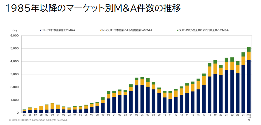 レコフデータによると、日本企業が関連する2025年のM&A取引件数は前年比8.8%増の5,115件と報告されています。取引金額も35兆円超と大幅に増加し、件数・金額の双方で過去最高を記録しました。