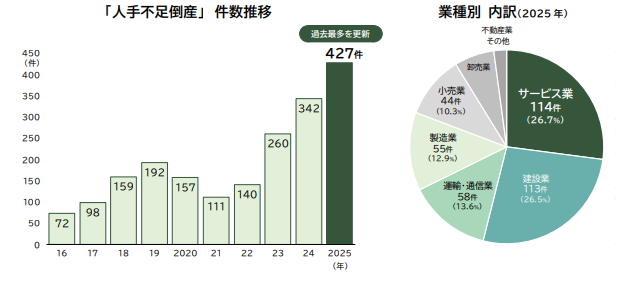 注目すべき「人手不足倒産」は427件と過去最多を大幅に更新しました。特に建設、サービス、物流、介護、小売など、人材依存度の高い業界では、「後継者がいない」以前に、「人が足りない」こと自体が最大の経営リスクとなっています。