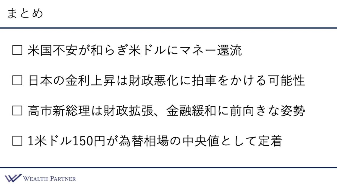 こうした政策は、基本的に米ドル高・円安に向かう方向に働きやすいと考えられます。したがって、高市氏が総理大臣になることは、今後もドル高・円安が継続する大きな理由の1つといえるでしょう。