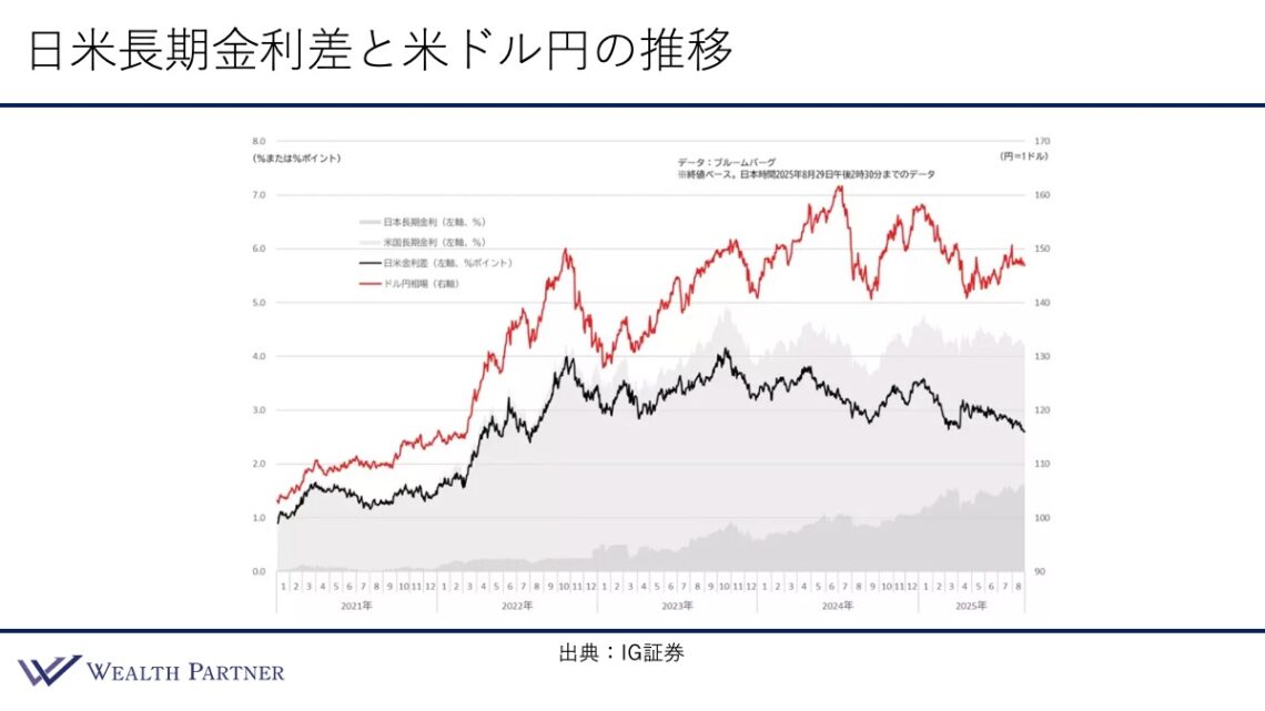 さらに、こちらは2025年8月末までのデータですが、2025年10月現在ではこのドル円相場がさらに上昇し、152円前後まで進んでいます。一方で、日米金利差は約2.4%まで低下しています。つまり、黒いチャート(=金利差)はさらに下がっているのに、赤いチャート(=為替)は右上に進み、ドル高・円安が一段と進行している状況です。