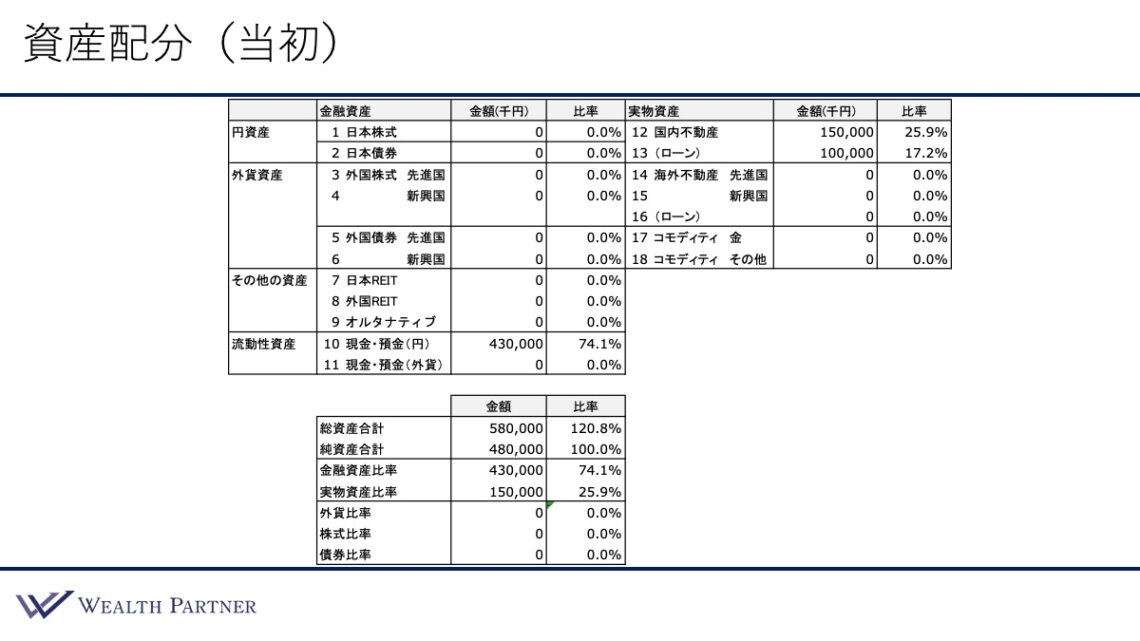 こちらの富裕層の方は、会社売却で税引後4億円が入ってきて、現金・預金(円)が4億3,000万円となっています。さらに、国内不動産1億5,000万円を保有し、住宅ローンは1億円あります。4億3,000万円のキャッシュのうち、4億円を資産運用する前提で考えていきます。