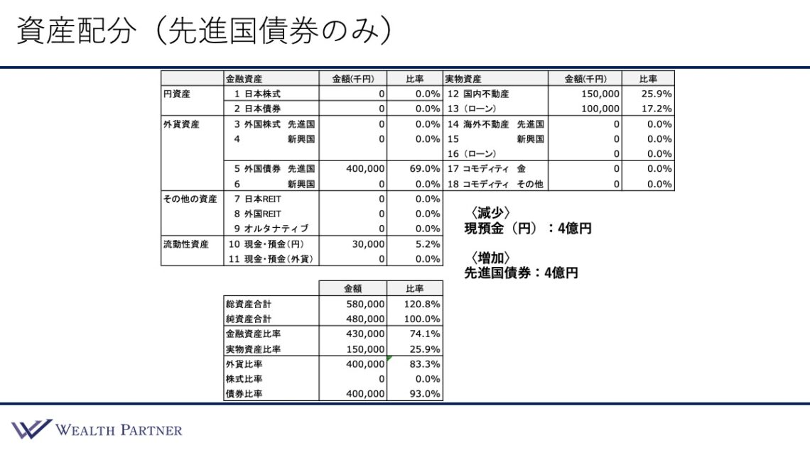 先進国債券だけに4億円を全て投資した場合の資産配分はこのようになっています。