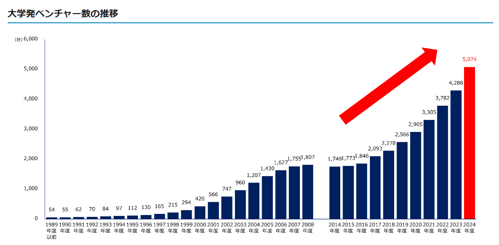 国内のスタートアップ市場は、現在、高い成長期にあります。経済産業省が令和6年度にまとめた資料によると、大学発ベンチャー企業数は、過去最高の伸びをみせています。2024年度の調査では、前年度より786社増加し、5,074社でした。