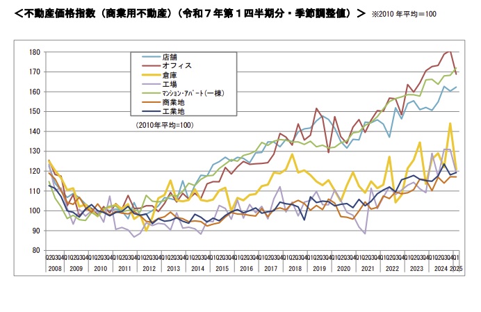 2025年の国内不動産市場は、引き続き堅調に推移しています。国土交通省の不動産価格指数(令和7年5月・令和7年第1四半期分)から見てみましょう。2010年平均の指数を100とすると、全国の住宅総合は143.0、マンション(区分所有)は216.4となっています。商業用不動産総合は144.8、店舗は162.3、オフィスは168.8、マンション・アパート(一棟)は171.9を示しています。