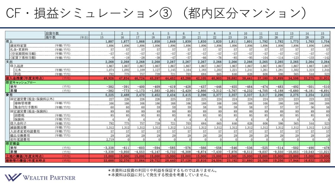 世古口「次に重要なのがこちらですね。実際この物件に投資したときのCFと損益のシミュレーションがこちらの表になっています。」