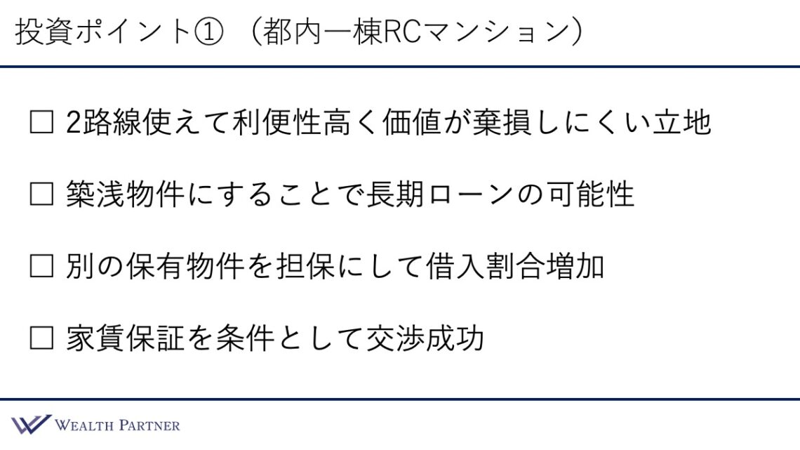 まず1つ目が立地の部分です。先ほども触れましたが、2路線使える利便性が高い、価値が棄損しにくい立地というところが投資ポイントの1つかなと思います。