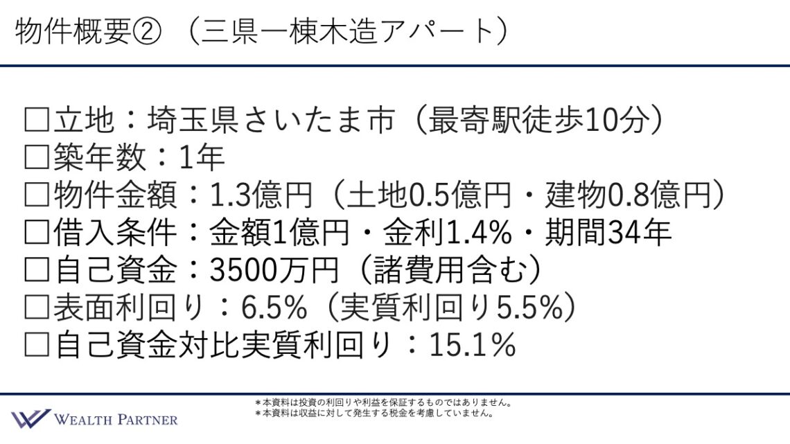 世古口「あとは一番下の自己資金対比の実質利回り。ここは借入を高めることによってかなり高まっていて、最初の一棟RCだと9%でしたが、こちらの物件は15.1%ということなので、やはり収益性を求める富裕層の方にとって一棟木造アパートというのは選択肢の1つということでしょうか。」